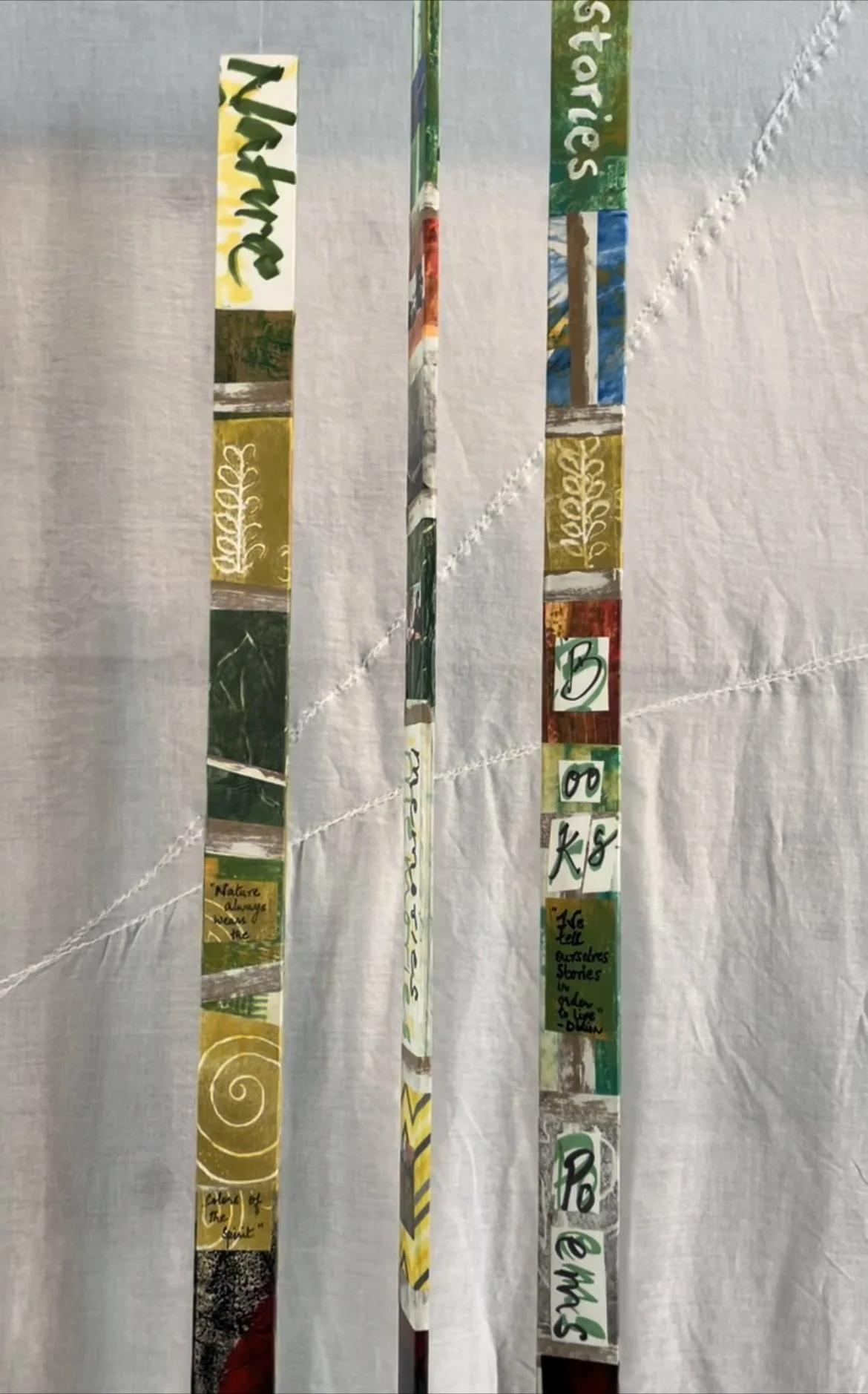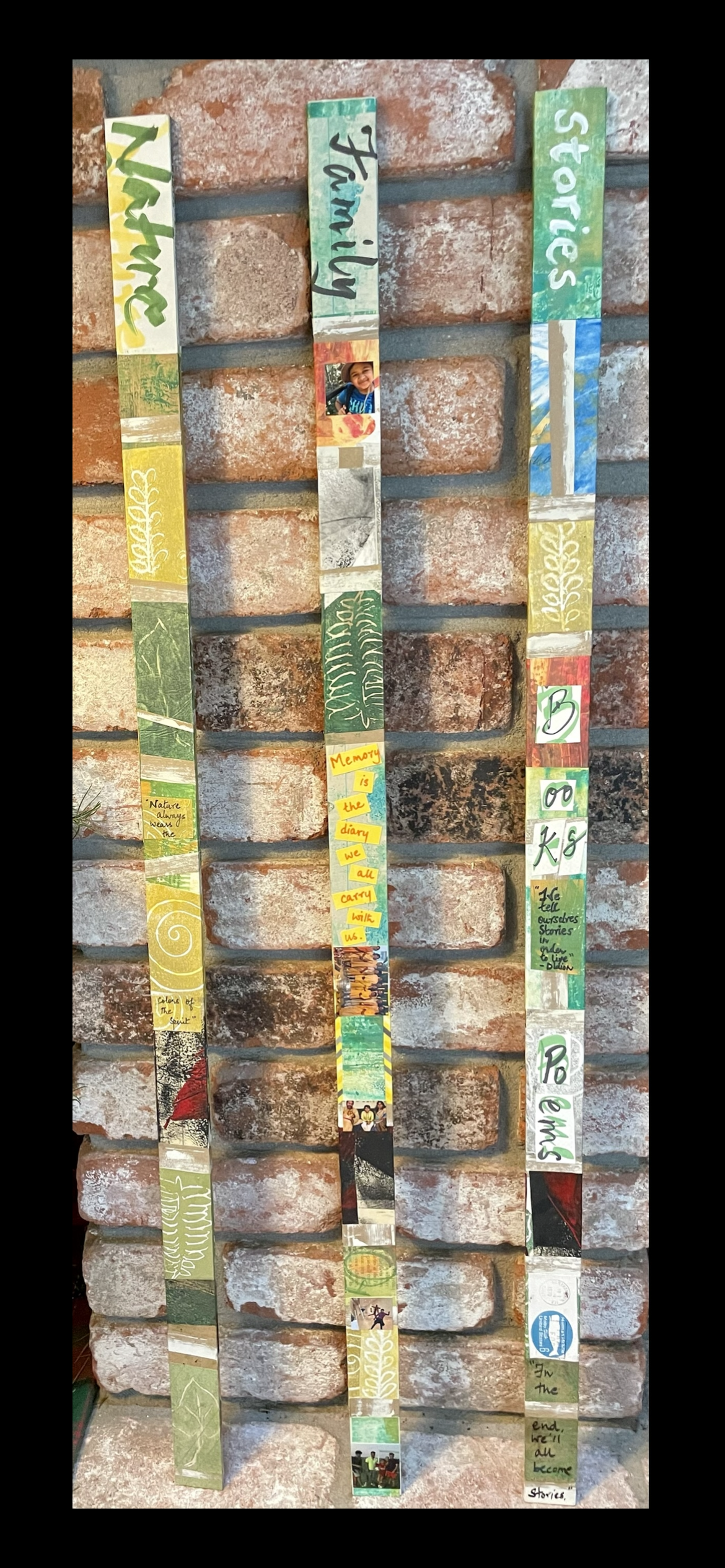 For the three yardstick pieces, I mostly used found vintage paper (old magazines; old books; old handwritten letters and stamps found in estate sales) that I either painted or drew on – several of the leaf prints are of leaves from my garden (ferns, fig leaves, ivy leaves) as are the yellow dried nasturtium flowers. With the color theme, my eye was drawn to greens and yellows with some bursts of reds and oranges - which to me, represented nature’s soothing powers. I believe words have immense power, so in the yard stick project there are some quotes on nature and on storytelling that speak to me.