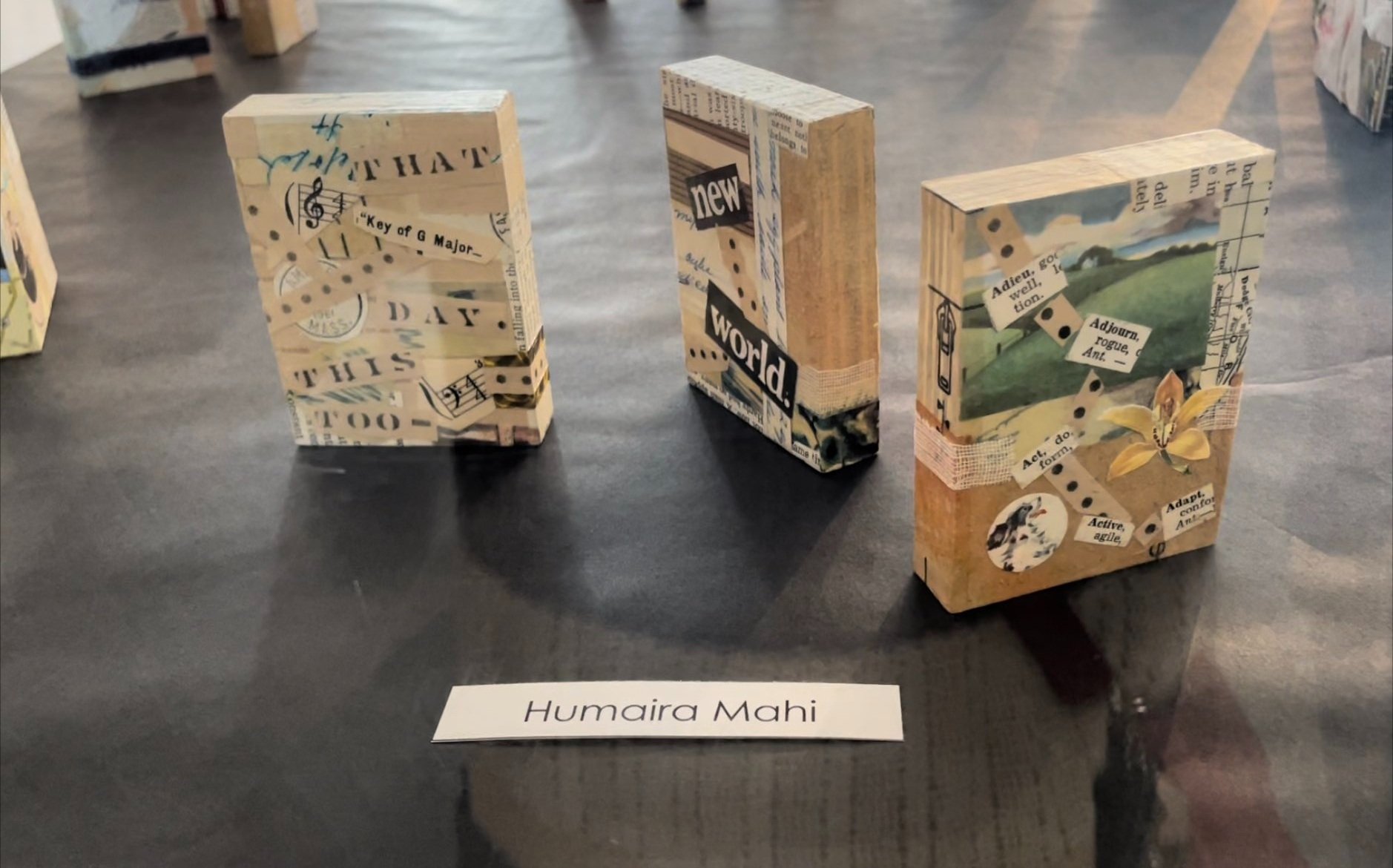 Block Project. CSMA Exhibition - March-April 2022. Materials used: Wood blocks; vintage paper from Life magazine from the 40s and other sources; stamps from the 40s; fabric; vintage handwritten letters from the 40s gathered from estate sales.
